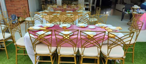 Servicio de alquiler de Sillas. WhatsApp 31040560916 y 3026336771 Tiffany Adultos en colores, Plateada y Doradas, en Alquiler a 5.000. Tiffany Kinder Blancas, a 4.000. fenix Doradas y blancas, con cojín. Alquiler 5.000 cada una y Sillas Camaleón Doradas a 5.000 c/u y silla Crossback en madera a 7.000