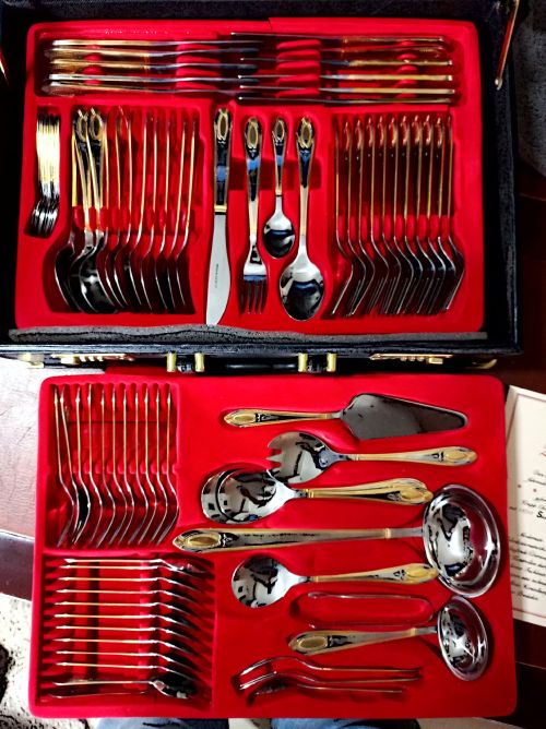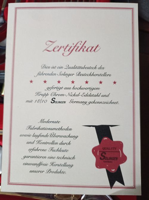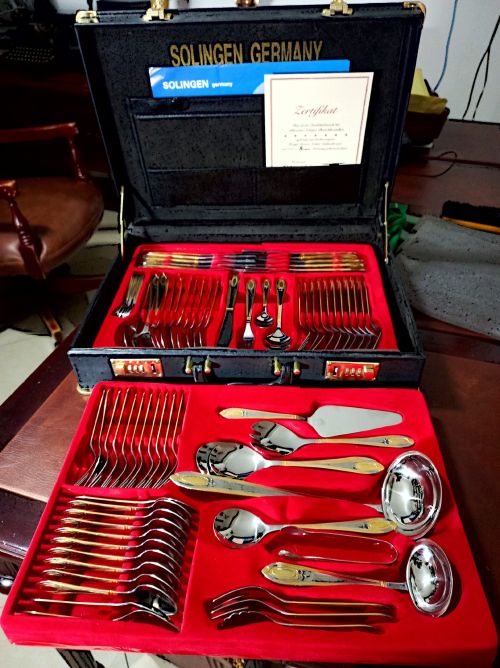 Juego de cubiertos clásicos de 84 piezas con estuche. Cubiertos de acero inoxidable de alta calidad, parcialmente chapados en oro. Marca Solingen incluye Certificado de garantía. Usado como nuevo.
