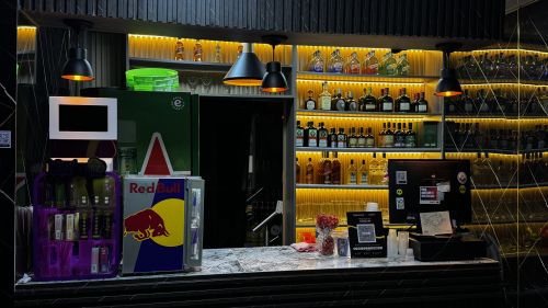 Diseño interior tipo club: barra equipada, cabina profesional para DJ, iluminación, sonido de alta gama.